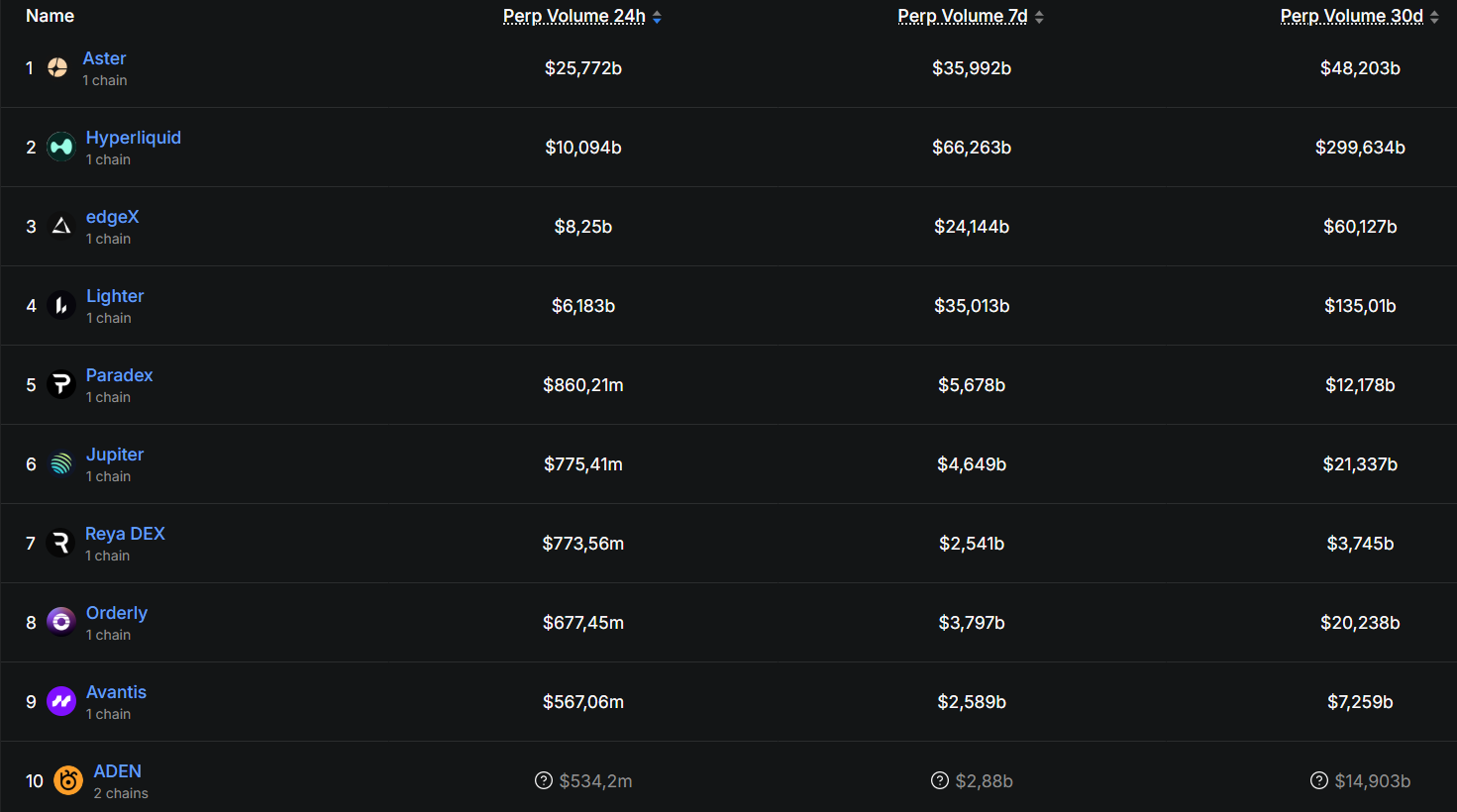 Сектор децентралізованих деривативів отримав нового лідера. Платформа Aster показала добовий обсяг торгів безстроковими контрактами в $25,77 млрд, що більш ніж вдвічі перевищує показник Hyperliquid — $10,09 млрд, зазначає DeFiLlama.