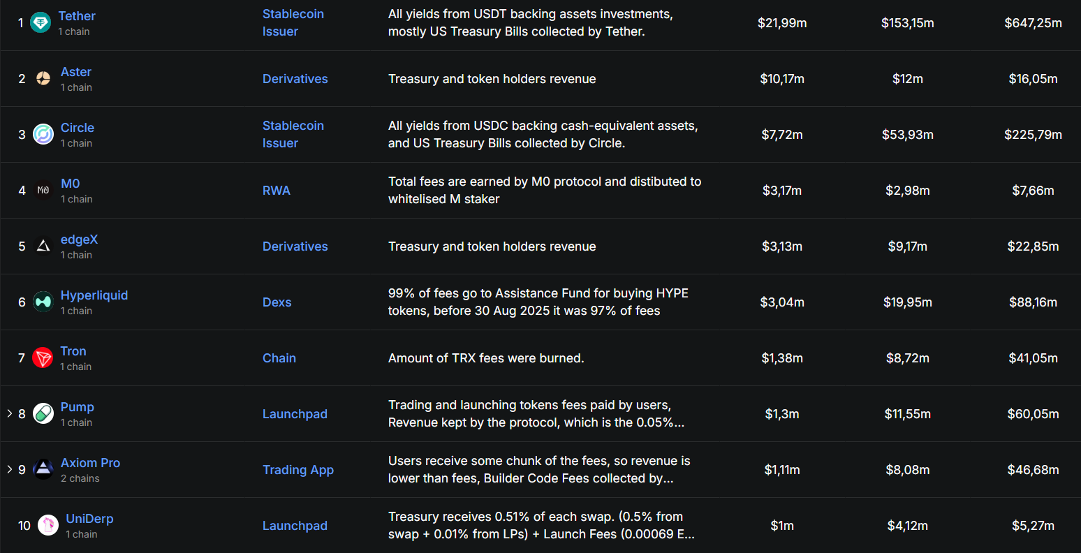 Успіх відображається і в іншому рейтингу: за добу біржа зібрала $10,17 млн комісій і зайняла друге місце серед усіх DeFi-протоколів. Hyperliquid у цій таблиці опинилася на шостій позиції.