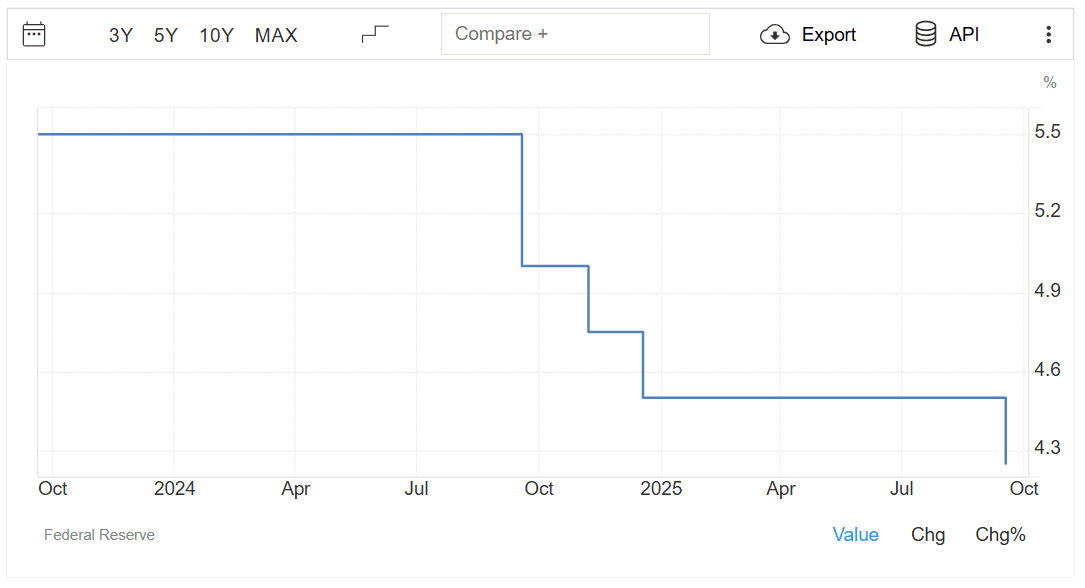 17 вересня 2025 року відбулося засідання Федерального комітету з операцій на відкритому ринку США (FOMC). Вперше з грудня минулого року регулятор знизив процентну ставку, встановивши її в діапазоні 4–4,25%.