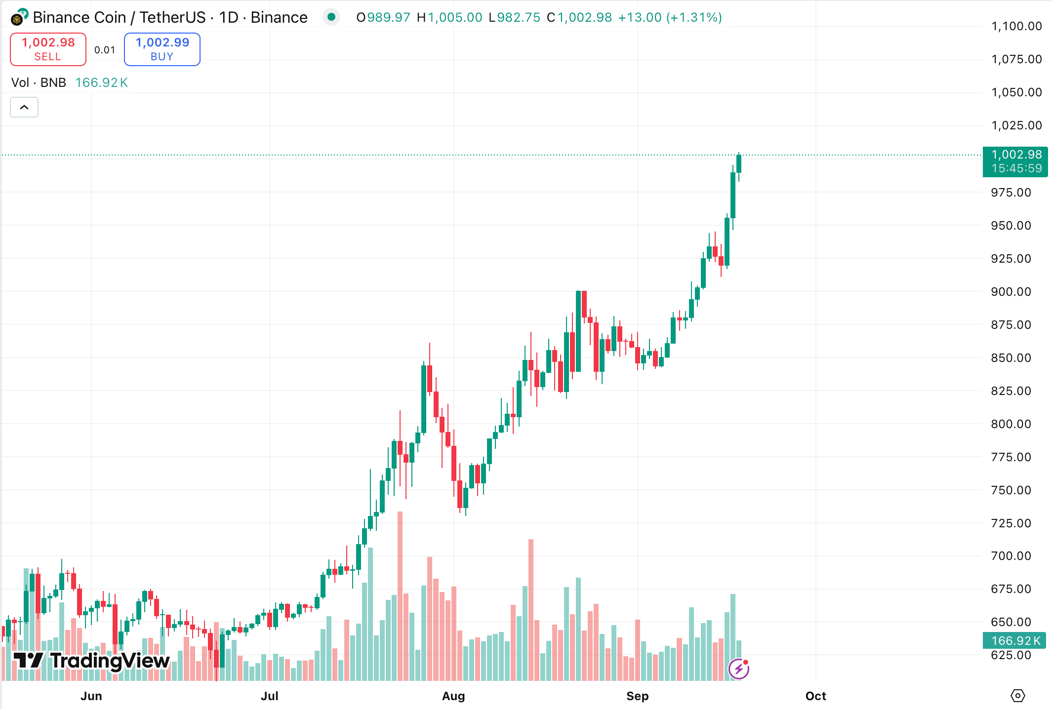 18 września 2025 roku token BNB osiągnął nowy rekord historyczny, przekraczając poziom 1000 USD. Według danych TradingView, w momencie publikacji moneta jest notowana na poziomie 1002 USD. Analitycy wiążą wzrost z dwoma kluczowymi czynnikami: decyzją Rezerwy Federalnej USA o obniżeniu stopy procentowej oraz informacjami o negocjacjach z Departamentem Sprawiedliwości USA w sprawie możliwego zakończenia zewnętrznego monitoringu nałożonego w ramach poprzedniego porozumienia.