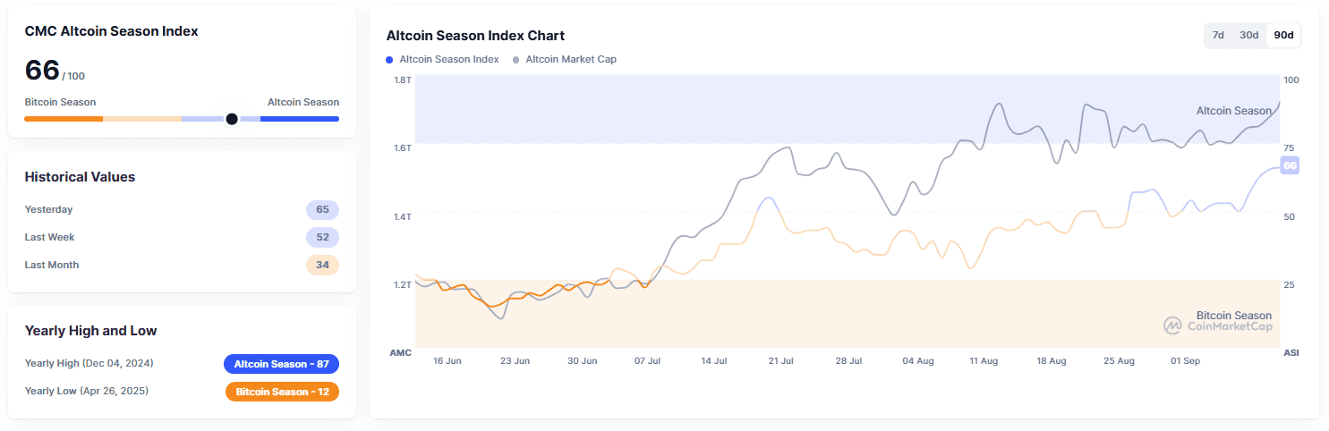 Indeks sezonu altcoinów od CoinMarketCap osiągnął wartość 66 punktów. Chociaż ten wskaźnik jeszcze nie przekroczył progu 75, wzrost o 13 punktów w ciągu tygodnia i 31 punktów w ciągu miesiąca wskazuje na przyspieszającą dynamikę i wzmacnia oczekiwania „sezonu altcoinów”.